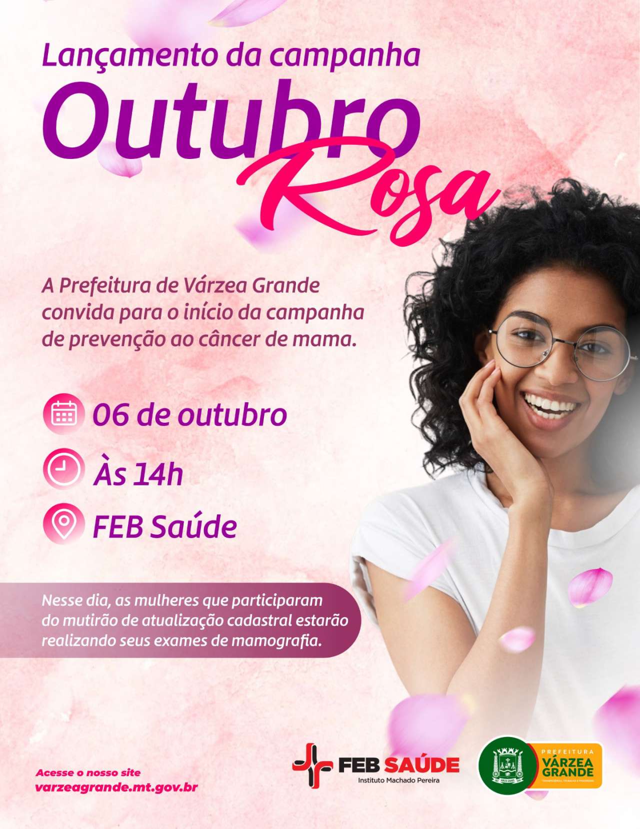 A Secretaria Municipal de Saúde de Várzea Grande realiza, na próxima segunda-feira (6), às 14h, na FEB Saúde, a abertura oficial da campanha Outubro Rosa, movimento dedicado à prevenção e ao diagnóstico precoce do câncer de mama.