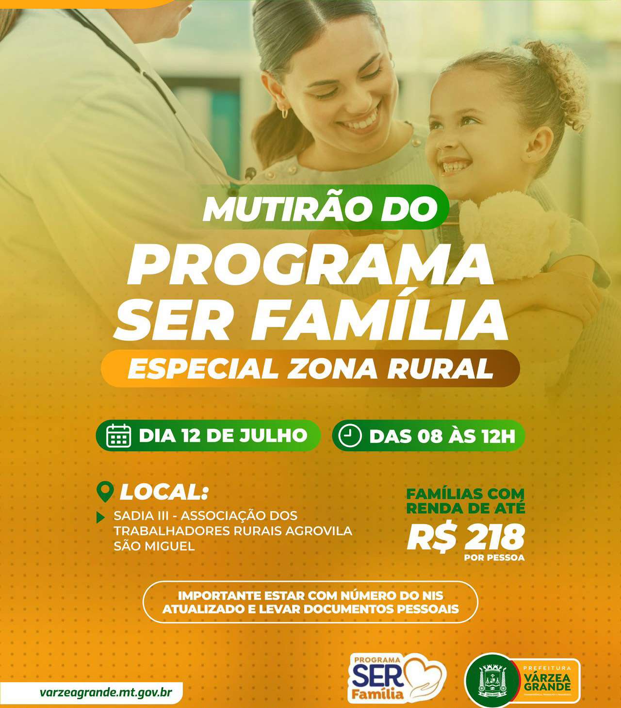 A Secretaria Municipal de Assistência Social de Várzea Grande realiza dois mutirões do Programa Ser Família em áreas rurais do Município. O primeiro ocorre neste sábado, 12 de julho, nas comunidades Sadia I e Sadia II, e o segundo na próxima terça-feira, 15 de julho, na comunidade Formigueiro, sempre das 8h às 12h.