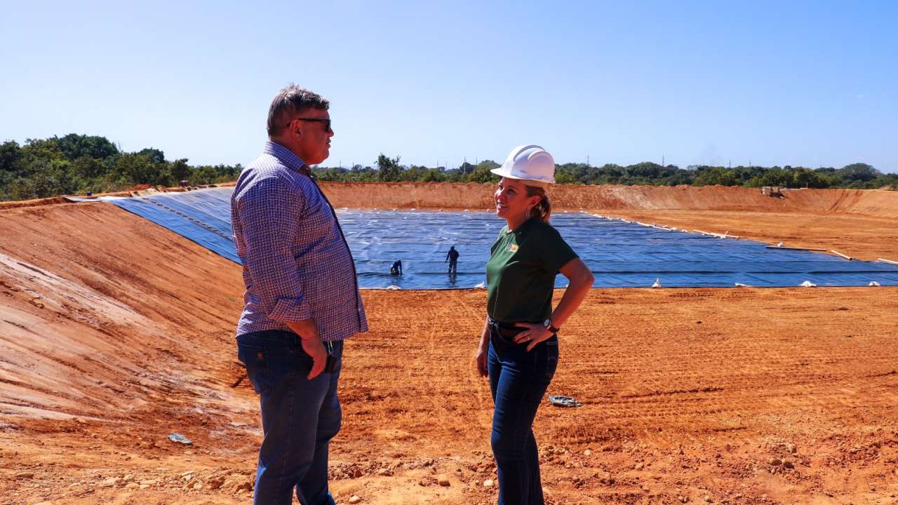Acompanhada pelo secretário municipal de Viação, Obras e Urbanismo, Celso Pereira, e por engenheiros da pasta, a gestora acompanhou de perto os serviços em andamento, com destaque para a aplicação da manta geomembrana em uma das lagoas de aeração, que é uma etapa essencial para garantir a impermeabilização da estrutura e a segurança ambiental do sistema.