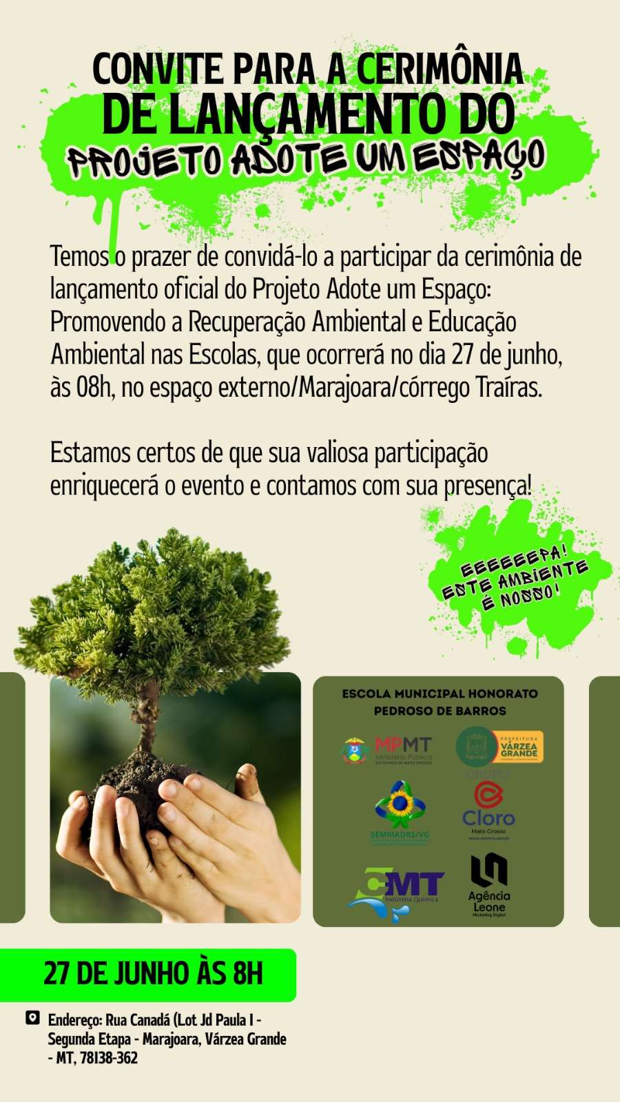 Inspirado no artigo 225 da Constituição Federal, que garante o direito ao meio ambiente ecologicamente equilibrado, o projeto propõe que escolas, empresas e instituições de Várzea Grande adotem áreas públicas próximas, como praças, canteiros, parques e Áreas de Preservação Permanente (APPs). Com apoio técnico da Secretaria de Meio Ambiente, as entidades recebem mudas, insumos e orientação especializada para garantir o sucesso das ações de plantio e manutenção.